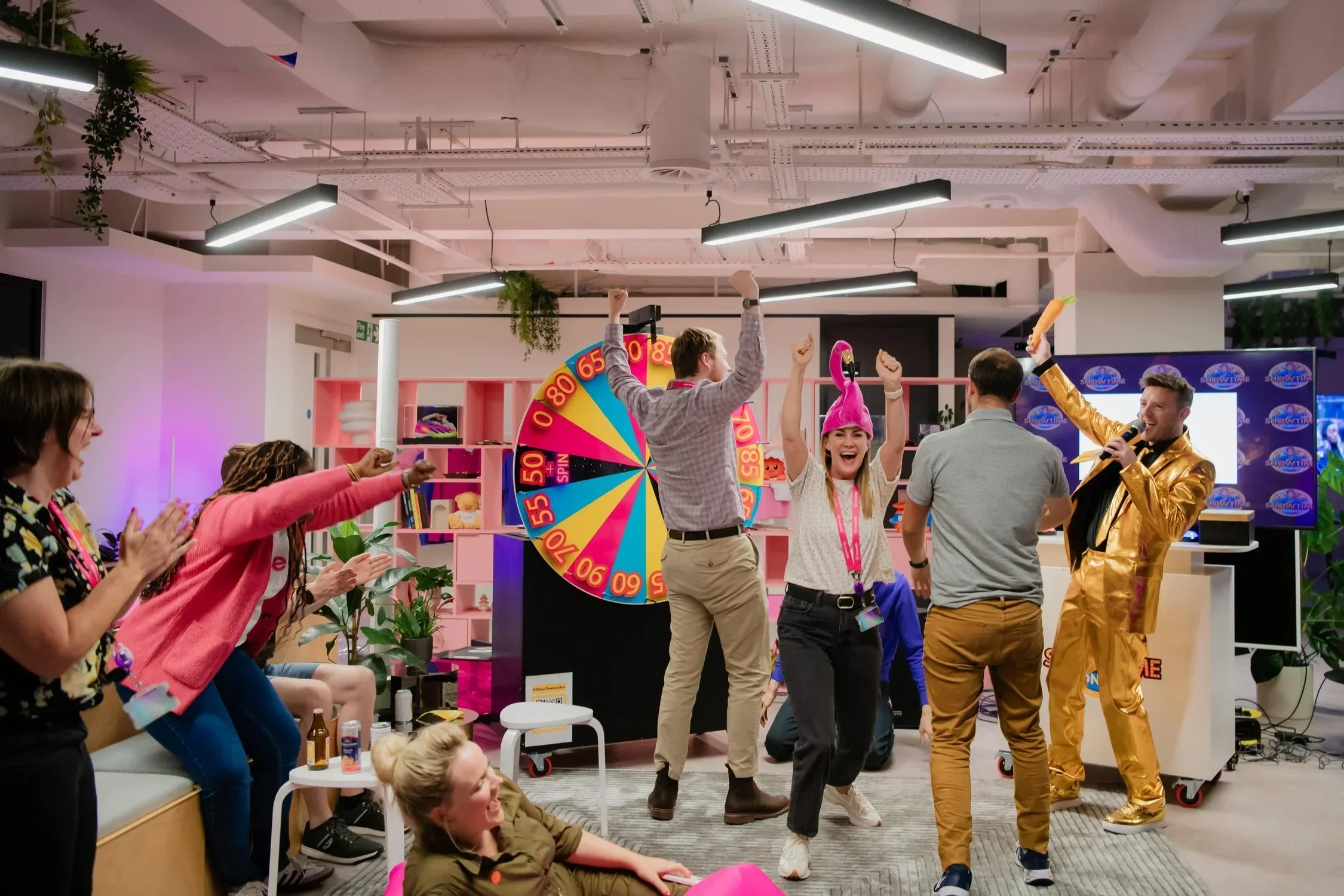 Buzzers, lights, wheel, and a host in a gold suit. In the office or venue!